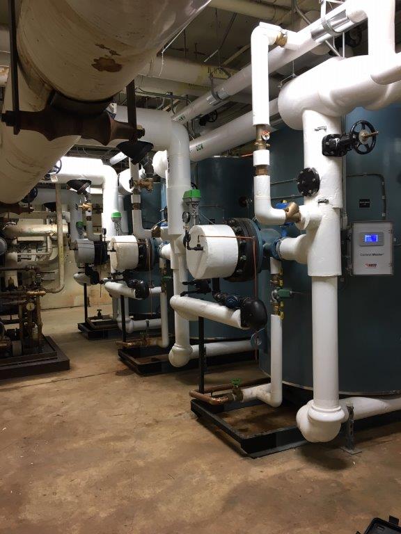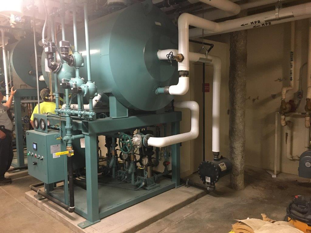 - Install two new Cleaver Brooks CFC 1,000 MBTU condensing boilers in existing mechanical space.